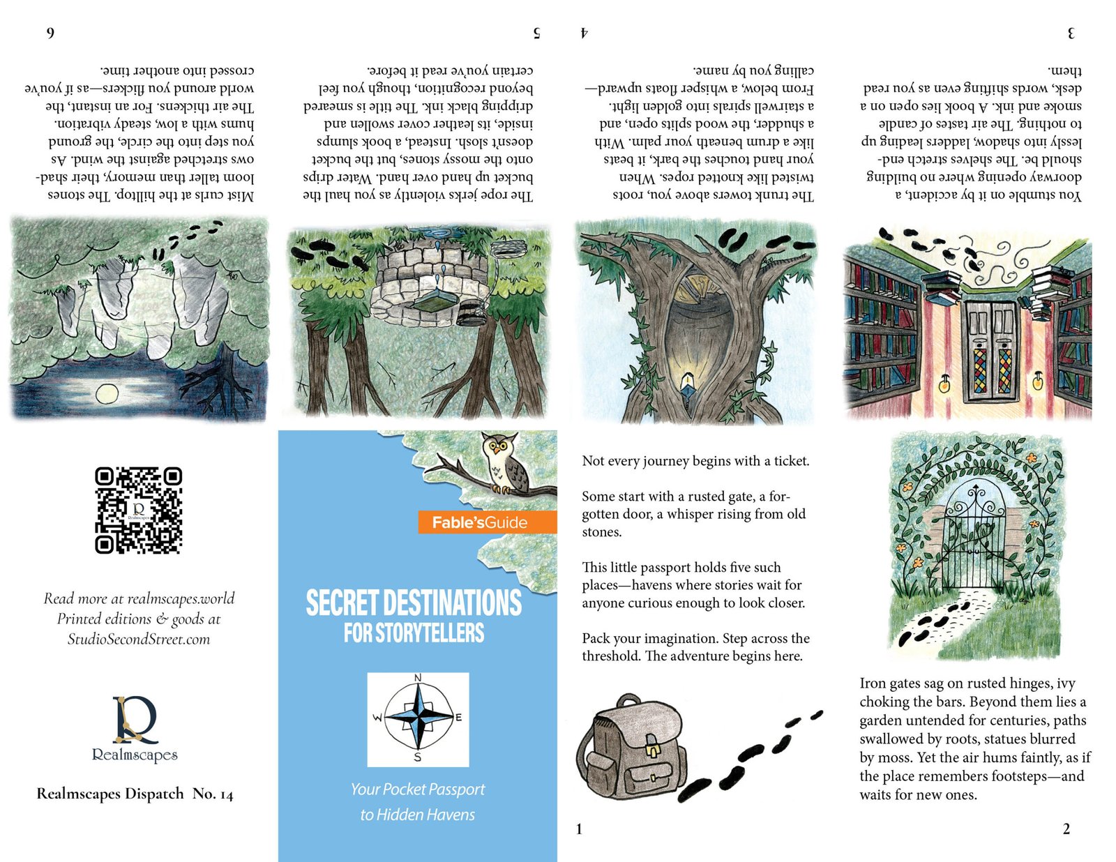 Step inside a pocket-sized passport to imagination. Fables’ Guide: Secret Destinations for Storytellers is a hand-illustrated mini-zine that looks like a travel guide — but instead of real destinations, it points you toward forgotten gardens, lost libraries, hollow trees, stone circles, and other secret havens.