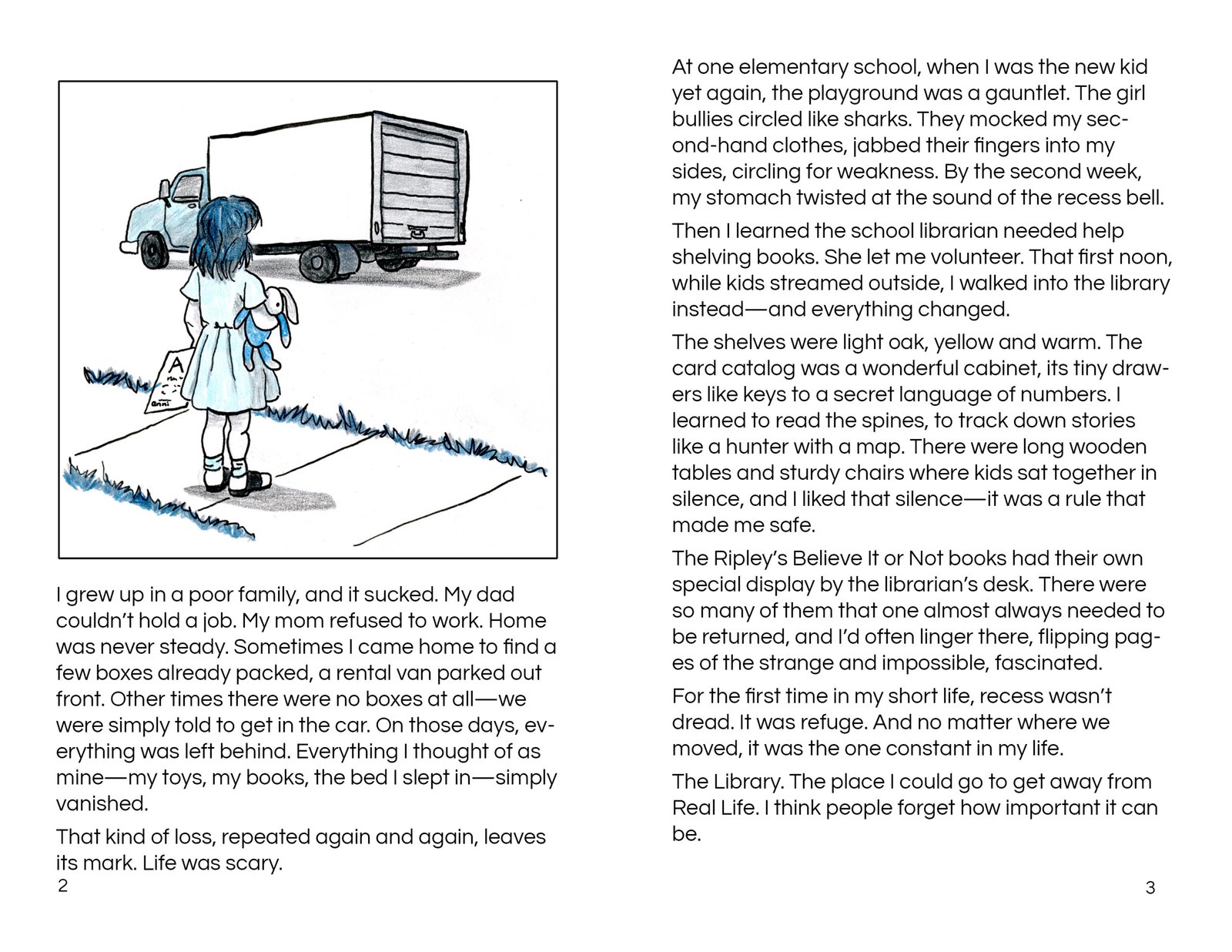 A hand-illustrated memoir chapbook about how libraries became a forgotten refuge — a safe space in a chaotic childhood, and a reminder of why they still matter today.