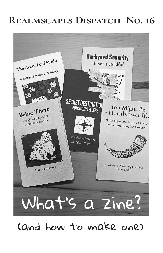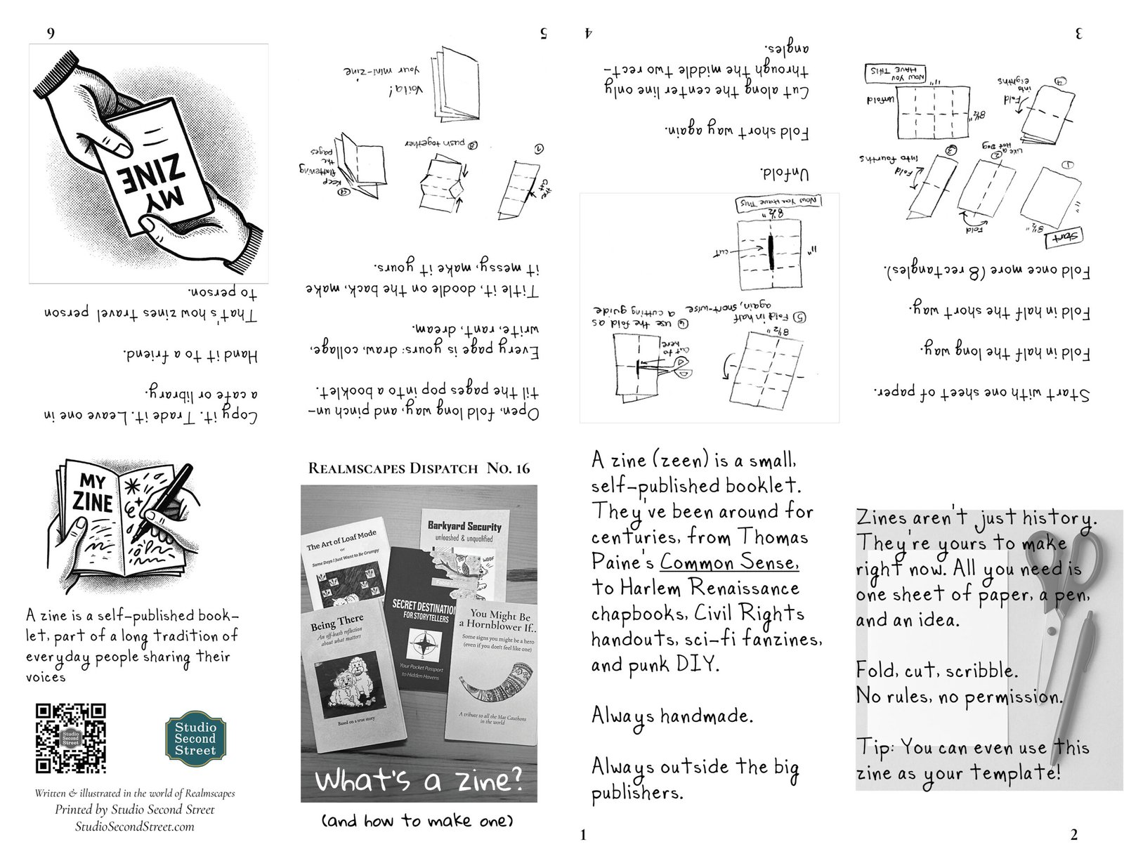 Realmscapes Dispatch No. 16 — What’s a Zine? (and how to make one) is a pocket-sized introduction to the joyful world of self-publishing. Part mini-history, part how-to, this handmade guide invites you to fold, cut, and create your own single-sheet zine using nothing more than paper, scissors, and imagination.